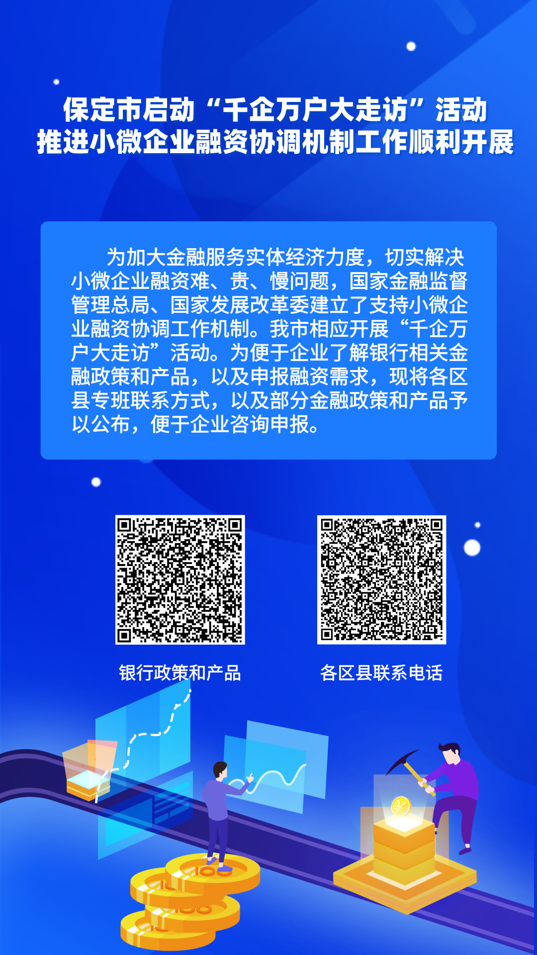 为加大金融服务实体经济力度,切实解决小微企业融资难、贵、慢问题,国家金融监督管理总局、国家发展改革委建立了支持小微企业融资协调工作机制。我市相应开展“千企万户大走访”活动。为便于企业了解银行相关金融政策和产品,以及申报融资需求,现将各区县专班联系方式,以及部分金融政策和产品予以公布,欢迎企业咨询申报。